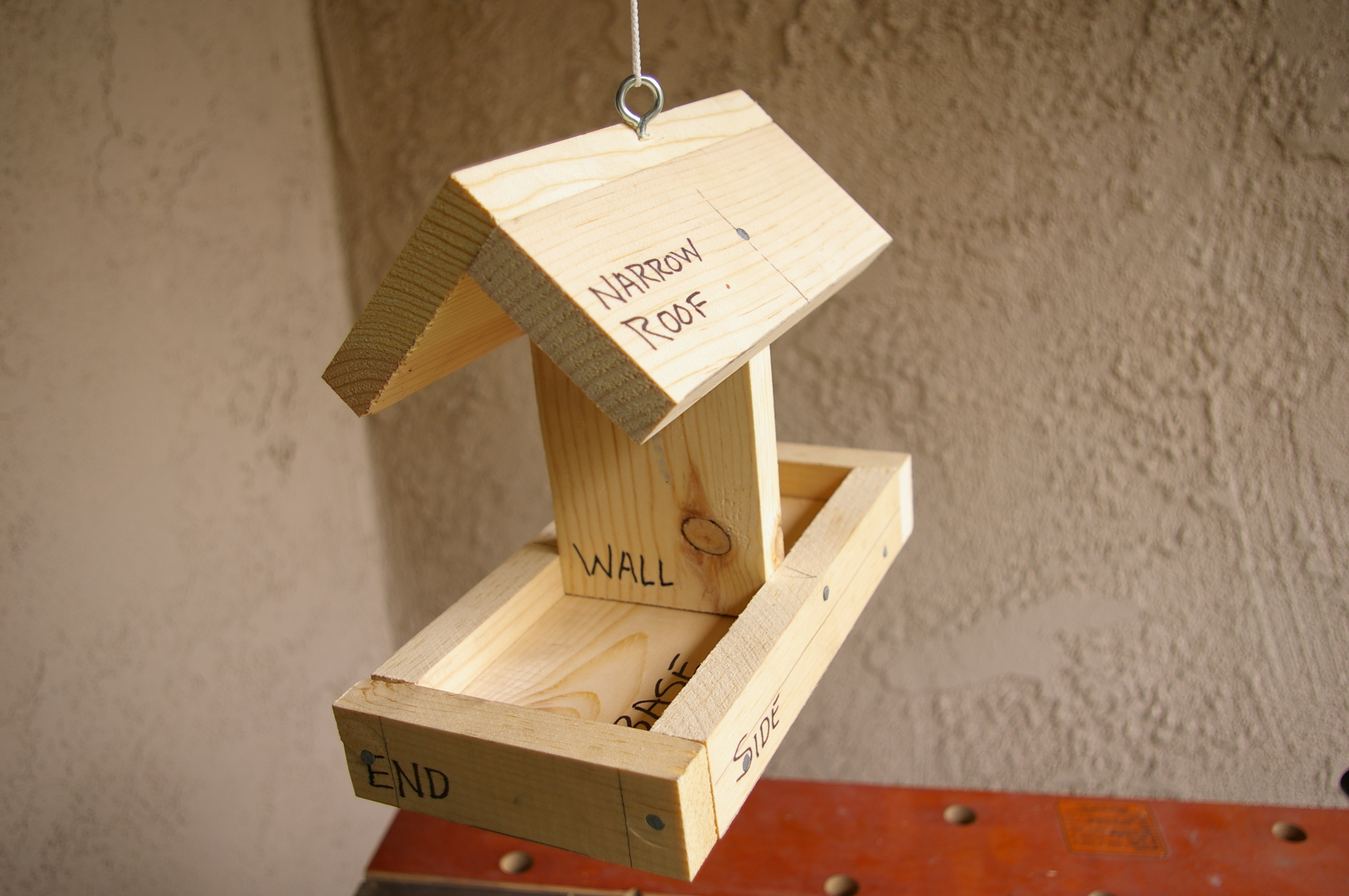 The bird feederThis is what we are going to build. All of the pieces of wood, the nails, and the eye screw are in your package. You will need the safety glasses from your package as well. From home you will need a hammer. Find a good place to hammer, on the floor of the patio is one idea.Use the links below the picture to move foreward and back. |