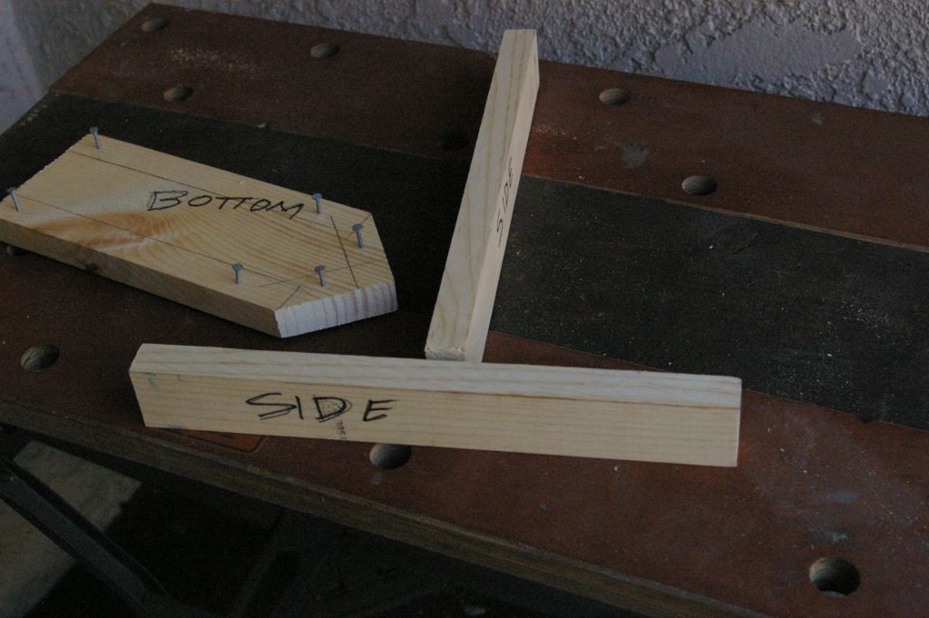 Place the two side pieces at an angle to each other. This will not fall over when you put the bottom on top of them.