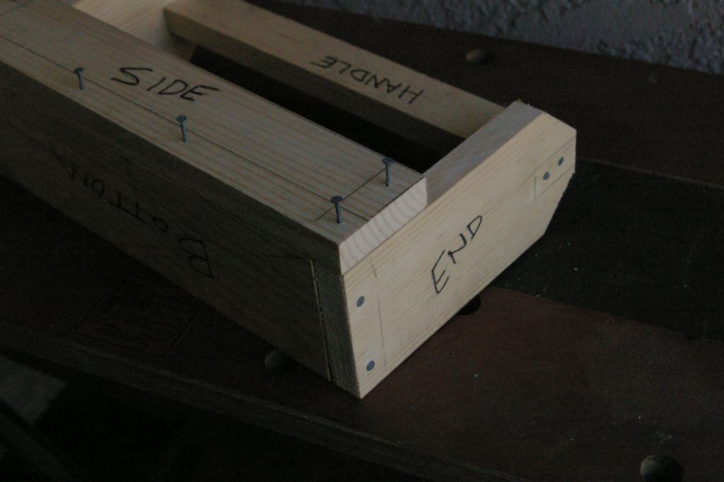 Put the parts that are nailed together on their side. Position the side piece on and line up one end.